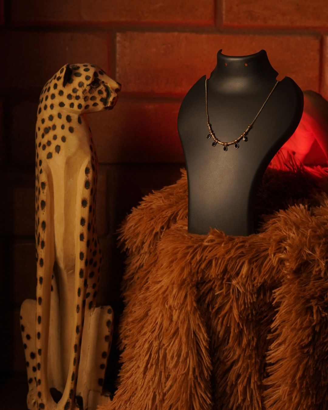 The Golden Drift Necklace captures the effortless beauty of nature’s flow, evoking images of golden sands drifting with the wind or a gentle river current.